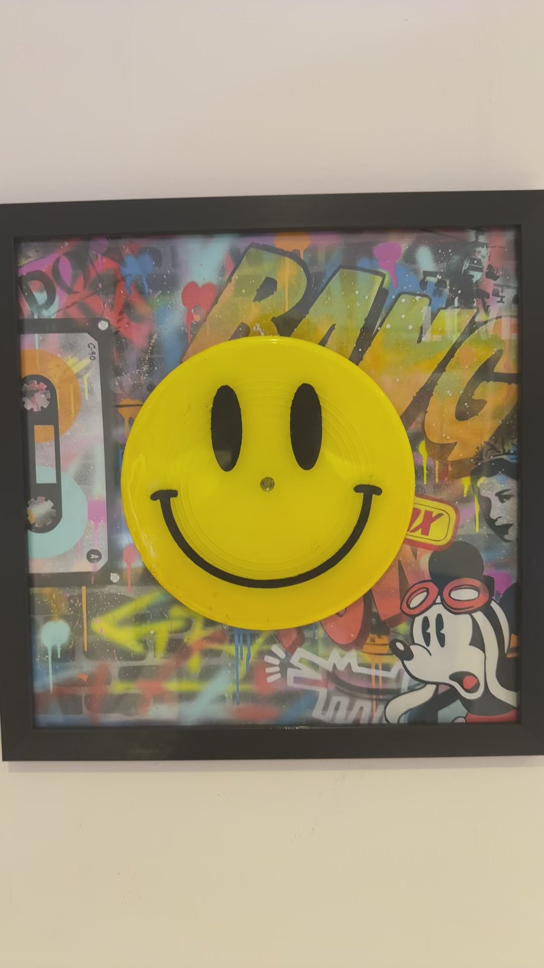Mixed media Urban Smileys. Background Giclee printed onto canvas from a BRT original design. Hand painted smiley into a 7" vinyl record, resined to finish. Then placed onto the front of the glass, giving a 3D look to this beautiful piece.